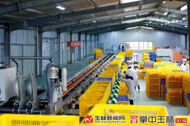 在博白县三桦石柳生态农业开发有限责任公司的分选车间内,工人们正忙碌着将沃柑精细化分选。