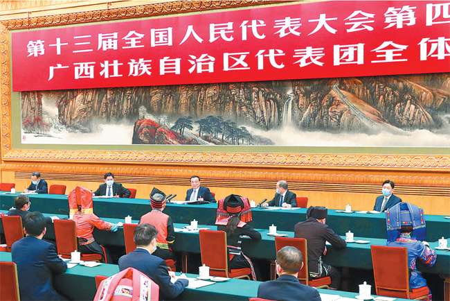 自治区党委书记、自治区人大常委会主任、广西代表团团长鹿心社主持会议。自治区党委副书记、自治区主席、广西代表团副团长蓝天立,以及吴炜、祝雪兰、陈保善、黄花春代表就推进工业高质量发展、构建对外开放新格局、发展农村特色产业等先后发言。李克强认真倾听,与大家互动交流。他说,去年,全国上下在以习近平同志为核心的党中央坚强领导下,齐心协力克服种种艰难险阻,疫情防控取得重大战略成果,经济社会发展取得来之不易的成绩,如期打赢脱贫攻坚战,“十三五”经济社会发展主要目标任务胜利完成。广西以习近平新时代中国特色社会主义思想为指导,贯彻党中央、国务院决策部署,各族群众奋力拼搏,去年经济增速超过全国平均水平,民生持续改善,各项工作都有新进展新成效。