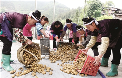 4月20日是二十四节气中的谷雨时节,三江侗族自治县良口乡寨塘村的百亩生态小土豆种植基地进入丰收期,当地群众纷纷采收土豆。
