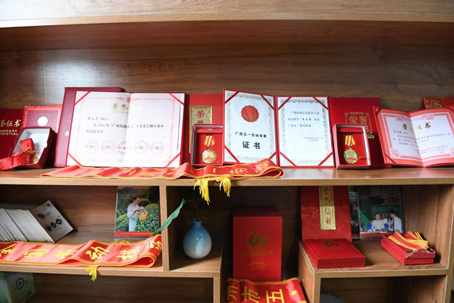 作为一名共产党员,吴永英充分发挥先锋模范带头作用,积极参与“党旗领航 电商扶贫”活动,带动贫困群众增收致富。多年来,她几乎跑遍了全国各地,在广西区内外建立专营店或直销店150多个,并成功进入100多个大卖场,部分产品销往台湾、香港、俄罗斯等地区和国家。她在平凡的岗位上做出了出色的业绩,2018年获得了“全国五一劳动奖章”,她的工作室里摆满了大大小小的奖状,每一张都凝聚着她的汗水。