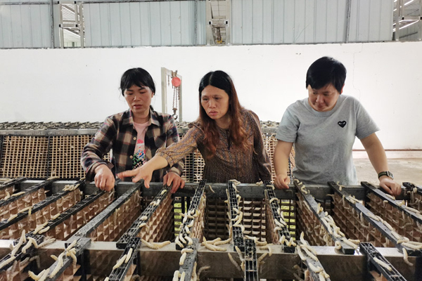 “现在蚕自己上蔟了,你一定要注意蚕室的通风透气,让茧白一些,上完蔟以后把蚕拼挂上去,及时把蚕砂清理出去。”眼前忙着指导蚕农做好桑蚕上蔟管护工作的就是林秀英。自1991年从广西农业学校毕业后,林秀英一直在鹿寨县乡镇水果站、农业技术推广站从事农业工作,对桑蚕养殖较有研究。林秀英在调研中发现,养蚕需要花费大量人工,于是她和同事苦心专研,经多次尝试、完善,终于在2019年发明出悬挂移动式养蚕上蔟装置和地面滑轮移动式养蚕上蔟装置,并获得国家专利,给蚕农们带来了极大便利。