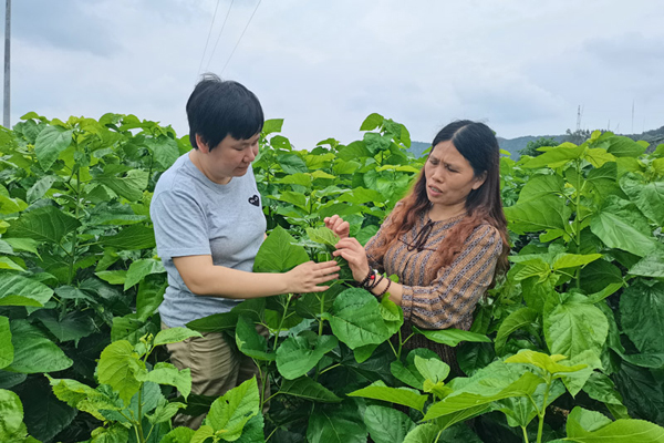 林秀英跟同事在桑园研究桑树病虫害情况。梁秋萍摄