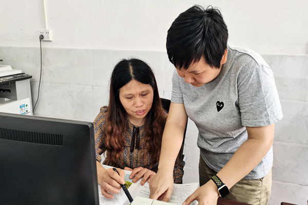 林秀英跟同事查阅资料研究桑树管护方法。梁秋萍摄