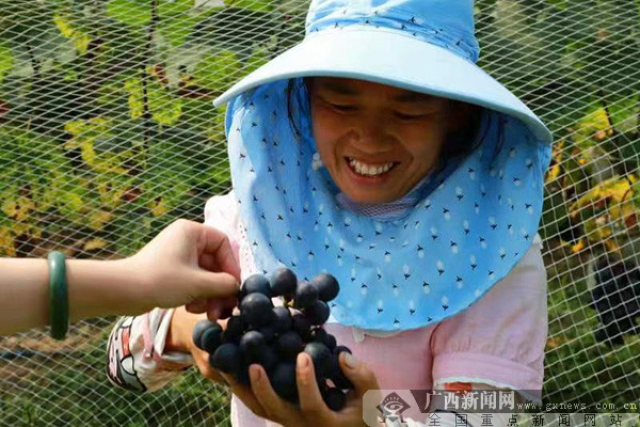 日前,记者在位于义敏村的葡萄园看到,大棚里整整齐齐的葡萄架下,一串串硕大饱满的葡萄缀满枝头,等待丰收。葡萄园主人涂桂平正忙着采摘各地客商新一批预定的葡萄,一旁慕名而来的游客正在体验自摘葡萄之趣。