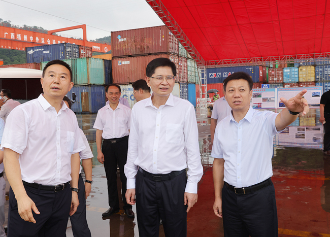 长洲水利枢纽船闸是目前国内通过能力最大的内河船闸群,2020年货物通过量突破1.5亿吨,超越了三峡船闸。在长洲水利枢纽坝下游的梧州市李家庄码头,不少船舶正在排队等待靠岸。李家庄码头于2018年通过竣工验收,今年1—5月完成港口货物吞吐量411万吨、集装箱吞吐量18.75万标箱,同比增长超过41%。“增长的货运量主要来自哪些地区?货物转运存在什么困难和问题?”蓝天立详细询问西江沿岸码头和铁路连接线建设情况。听着江面汽笛声声,他说,我们要用好西江沿江码头宝贵的岸线资源,以基础设施一体化为方向,加快发展多式联运,实现货物转运无缝衔接;相关部门要聚焦铁路连接线建设问题开展会商,努力提升西江黄金水道整体效能,使广西对接粤港澳大湾区的物流通道更加畅通、运输更加便捷。