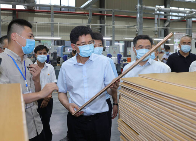 6月23日,自治区主席蓝天立来到贵港市汉邦木业有限公司,了解项目建设投产情况。梁凯昌/摄