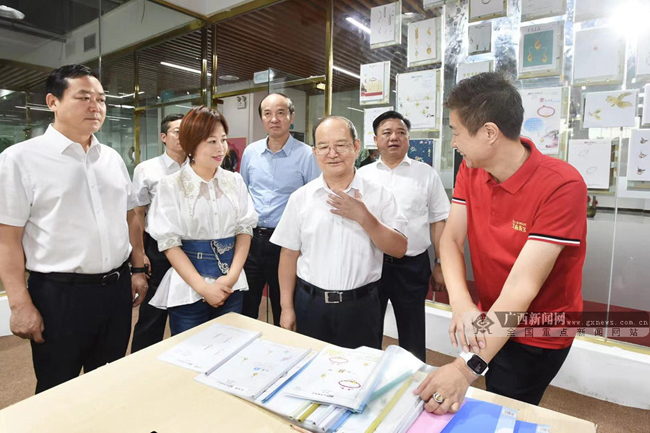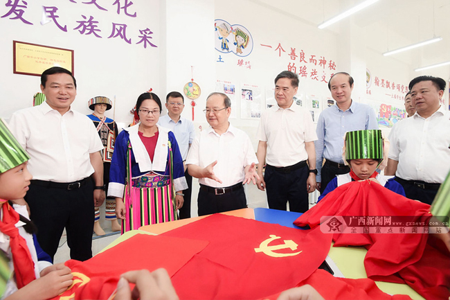 在贺州市民族学校,鹿心社详细了解学校办学情况,观看“土瑶”手工艺文化传承展示,与正在画画、刺绣的学生亲切交流,勉励大家努力学习,学好本领,茁壮成长。记者 邓华 摄
