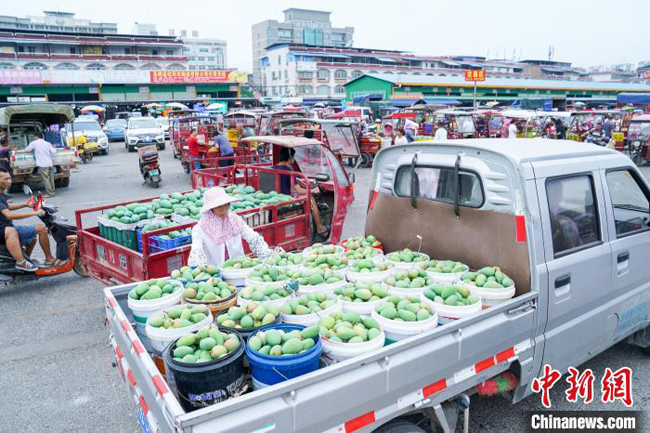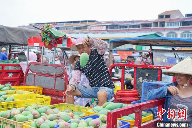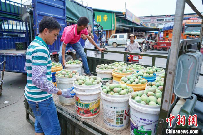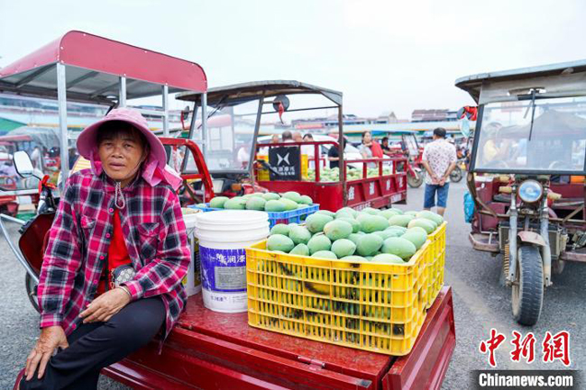 果农表示,今年由于芒果大量上市,收购价格偏低,这一车好果一斤约1元左右,这一车卖出700元。 陈冠言 摄