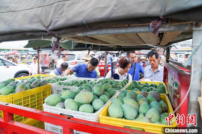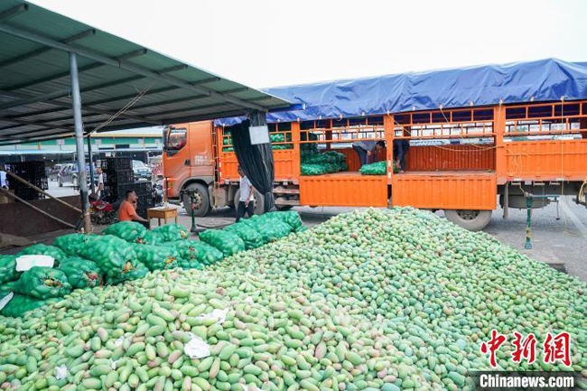 图为一商户档口前摆放着刚收来的芒果。 陈冠言 摄