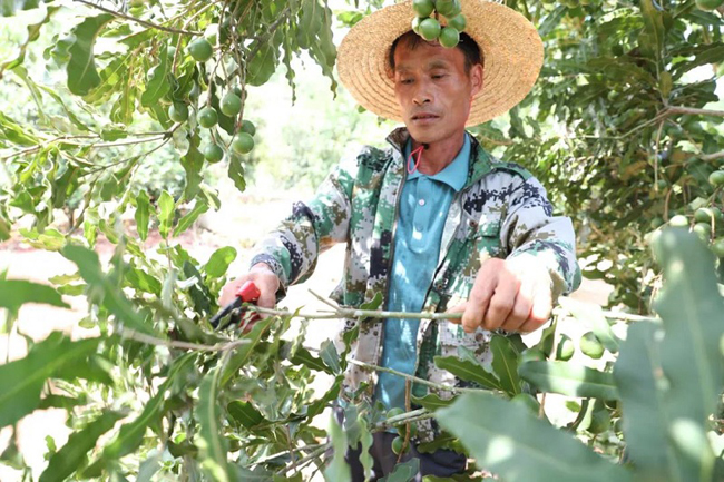 松柏村的致富带头杨仕稳在修枝剪枝,查看坚果长势