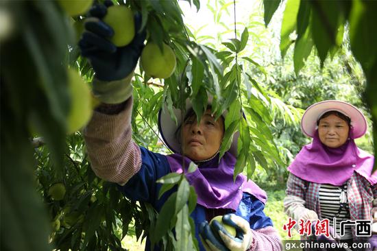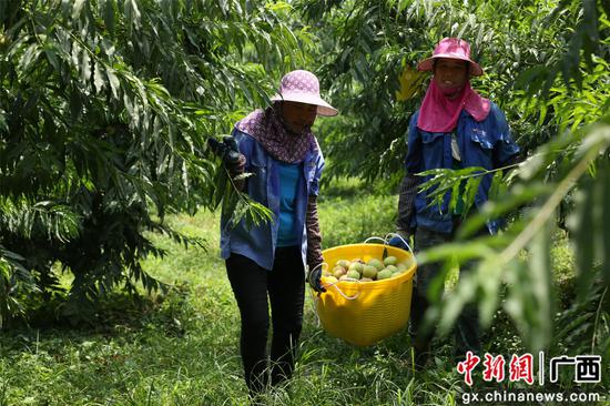 7月6日,走进广西柳州市柳江区穿山镇国春鹰嘴桃种植基地,工人正忙着采摘枝头青中带白,白里透红的鹰嘴桃。