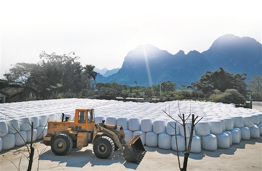 在龙州县逐卜乡锦阁村蔗叶加工厂,青贮饲料被裹包存放。