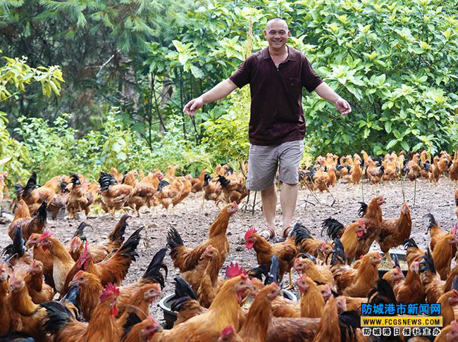 梁秀芳的哥哥梁秀维正在养鸡场内帮忙赶鸡。