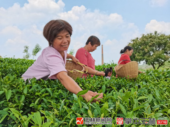 卢花暖(左一)与姐妹们一起在茶园采摘茶叶。
