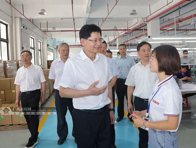 自治区主席蓝天立来到大化乡村振兴项目农民工创业园,走进企业车间了解群众就地就业等情况。