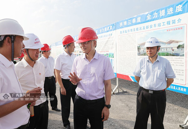 自治区主席蓝天立深入贵南高铁都安站场,听取我区高铁“十四五”规划介绍,考察贵南高铁建设进展。