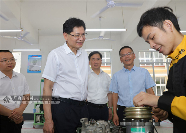 自治区主席蓝天立来到都安职业教育中心实训车间,详细询问学校教育模式,学生就业等情况。