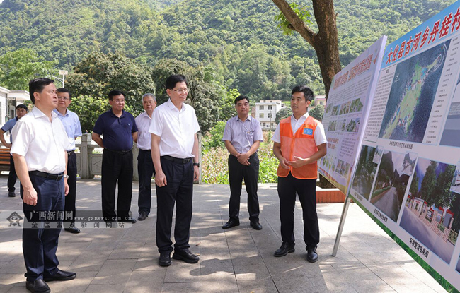 自治区主席蓝天立来到大化瑶族自治县古河乡丹桂村调研乡村振兴工作。在村里的小广场,蓝天立仔细听取驻村第一书记介绍红色旅游发展等情况。