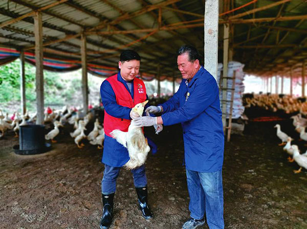 “鸭司令”卢美臣(右)给驻村工作队员介绍如何查看鸭子的身体状况(西乡塘区宣传部供图)