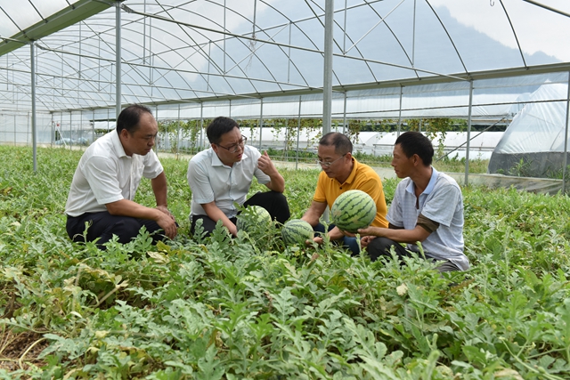 随后,周桥到新圩镇和睦村启创果蔬种植家庭农场调研。走进农场,映入眼帘的是几十个设施农业大棚,按照季节轮换种植各种应季果蔬。进入大棚里,瓜藤下的西瓜又圆又大,格外夺人眼球。周桥蹲下后手捧一个西瓜仔细端详,并与农场管理人员交流,详细了解生产管护、市场销售情况。