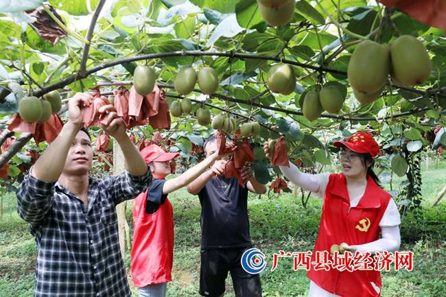 图一:8月19日,融安县大良镇石门村猕猴桃种植园里,志愿者们和村民正在忙着采摘猕猴桃。