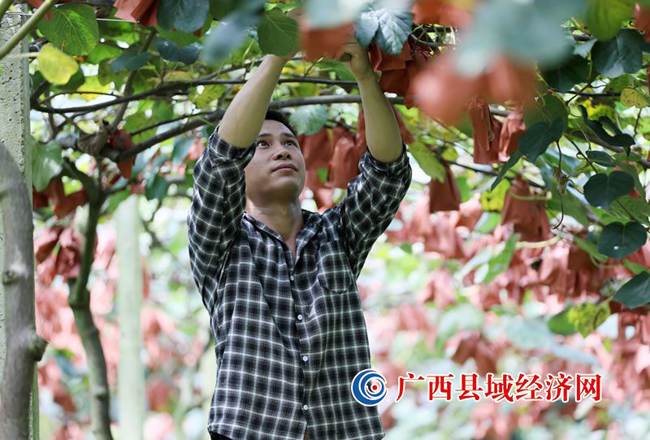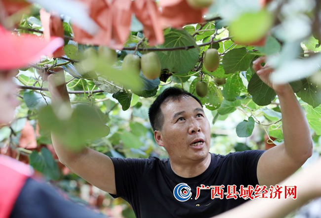 图三、四:8月19日,在融安县大良镇石门村猕猴桃种植园里,村民正在采摘猕猴桃。