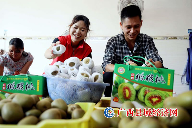 图六:8月19日,在融安县大良镇石门村猕猴桃种植园里,志愿们和村民正在打包猕猴桃。