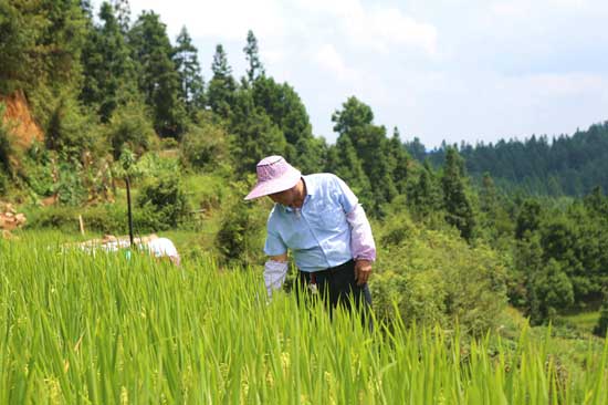 韦丰付在田间观察优质稻长势。