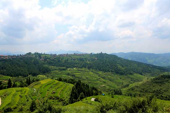 近日,走进高武村,可以看到宽阔坚硬的道路、整齐的路灯,和独具苗族特色的风雨戏台、芦笙坪等活动场所。而当站在山顶上放眼望向高武村时,会看见不一样的景色。在黛青色的山顶缓坡之上,祥和的村落若隐若现。山腰上自然天成的千层梯田,抱团蜿蜒。