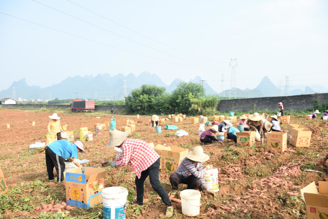 近日,在沙子镇协中村委格水塘村村民黄国华家的百亩红薯地上,机械开挖、三四十位农民装箱、小型拖拉机搬运……这样热闹的场面每天上演。