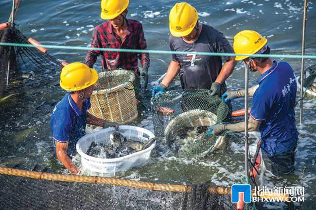 合浦县桂台鲔丰渔业核心示范区里,工人们正在拉网起鱼。