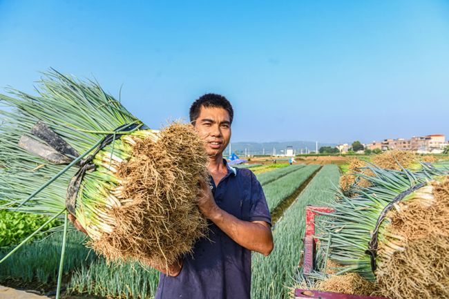 田东县祥周镇中平村香葱喜获丰收,农民脸上笑开颜。