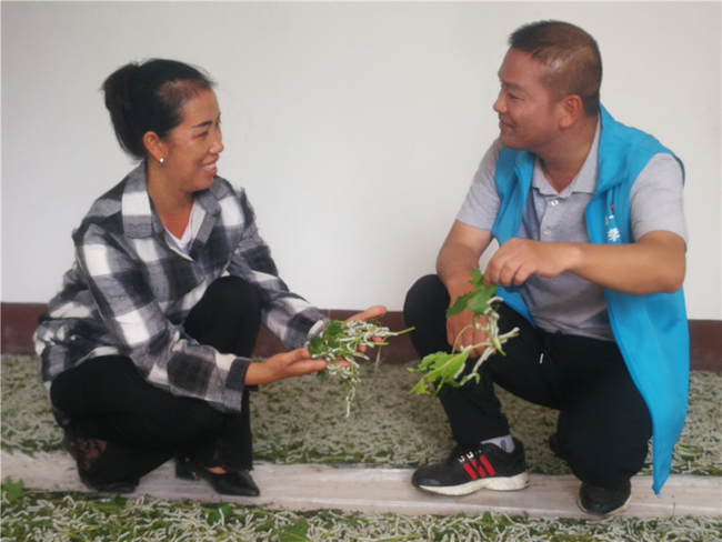 李林第一书记(右)到蚕农家里察看蚕宝宝成长情况。