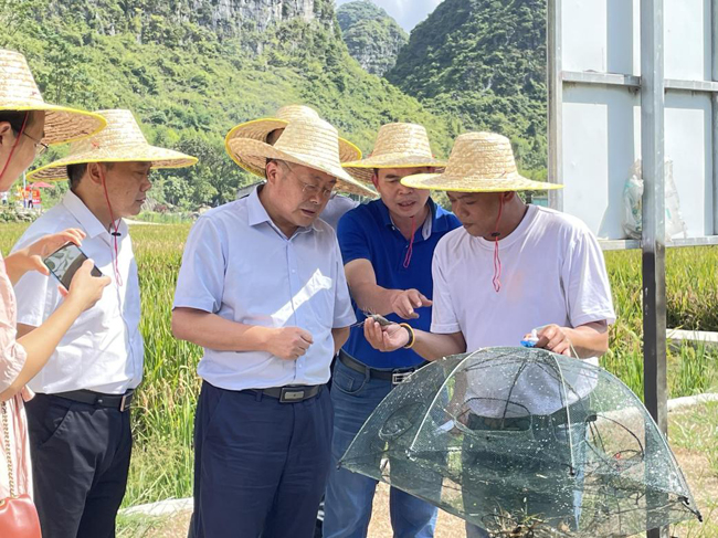 院士团队一行首先来到柳江区里高镇柳州螺蛳养殖技术示范基地考察调研,基地负责人详细介绍里高基地的稻田综合养殖情况,从开始的稻螺养殖模式,发展到现在开展稻-螺-虾(罗氏沼虾)、稻-螺-鳅(四倍体鳅)等多种养殖模式,并开展螺蛳养殖饲料投喂实验。
