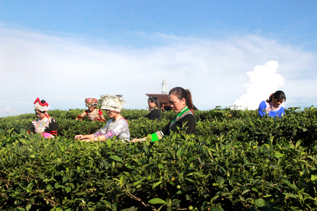 西林县古障镇水头村高山生态茶园依然郁郁葱葱,青翠叠绿。云涛雾海下,嫩绿的新芽挤满枝头,将附近的村寨装扮得格外美丽多姿。清晨的第一缕阳光还未到,忙碌的茶农已经在生态茶园里开始了一天的劳作,星星点点的洒落在层层叠叠的茶台中,构成了一幅幅美丽迷人的山村画卷。