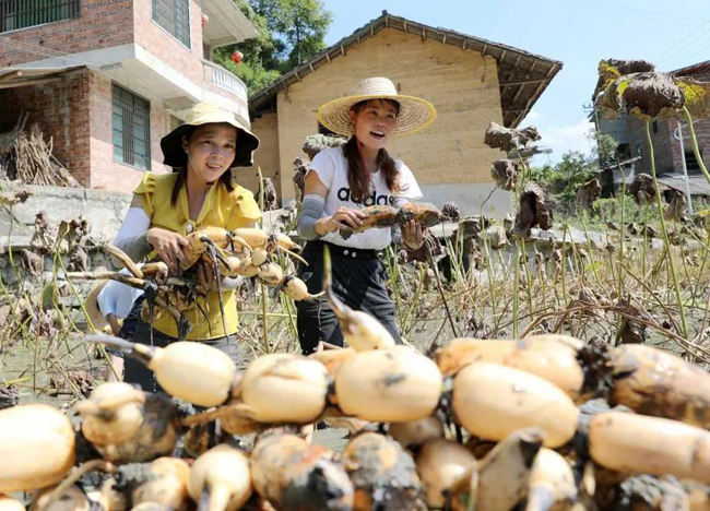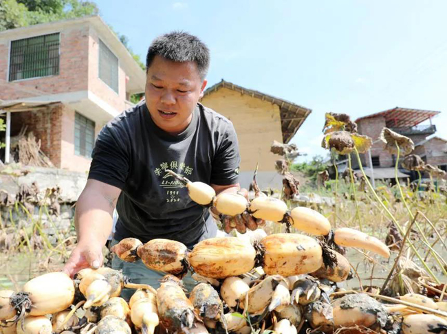 今年,该村通过土地流转方式,采用“公司+合作社+基地+农户+订单”模式,大力发展“莲藕+鱼+螺”综合种养产业,让当地20余名村民在家门口就业,实现顾家、增收“两不误”,预计今年每亩可产莲藕约1500公斤,目前,市场收购价为每公斤8元,亩产值至少可达1.2万元。