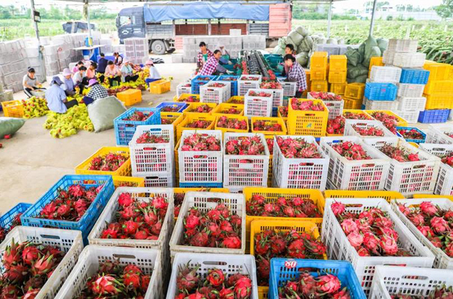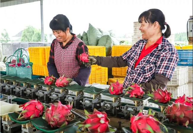 覃塘区推广应用种植新技术,并广泛推广运用选果机+人工的方式,对火龙果进行分拣、打包、装箱等初加工,不但增加了产品附加值,还为130名脱贫人员提供就业岗位,为巩固和拓展脱贫攻坚成果提供了持续产业增收保障。