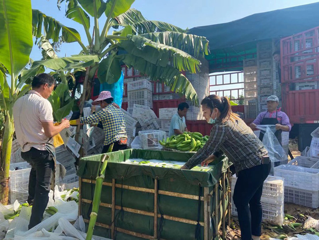 10月底至11月是香蕉成熟高峰期,一眼望去,富津村100多亩香蕉林郁郁葱葱,一串串个头饱满、色泽光亮的香蕉倒挂在树上,蕉香溢满山林,长势喜人。10多名工人穿梭在香蕉园内忙碌地采收香蕉,并将香蕉打包入框,发运广东。