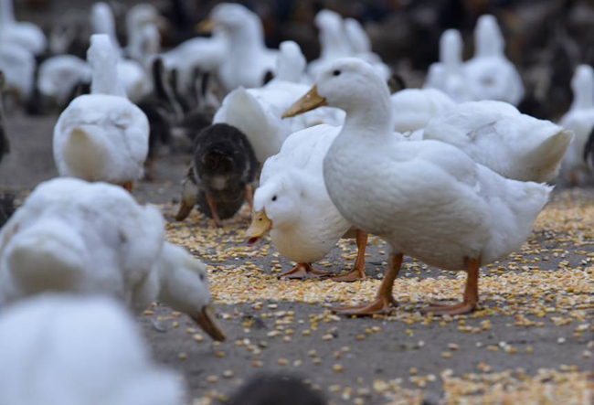 图为正在吃玉米的鸭群。