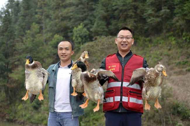 图为第一书记和养殖户一同展示生态鸭。