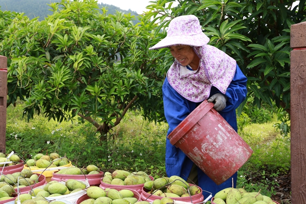 农户将刚采摘的芒果分装。