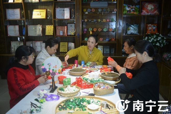 横州市巧娘之家志愿服务中心的学员们正制作工艺品。