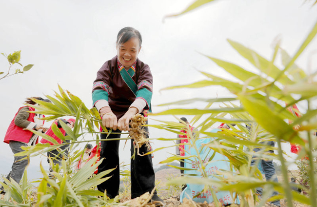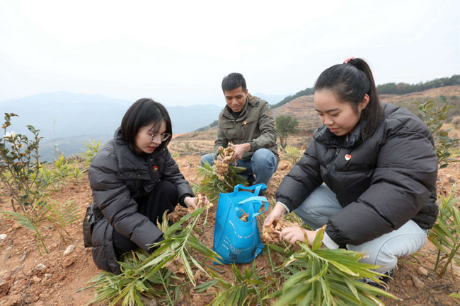 当地党员干部与农户一起在油茶基地里采收生姜。