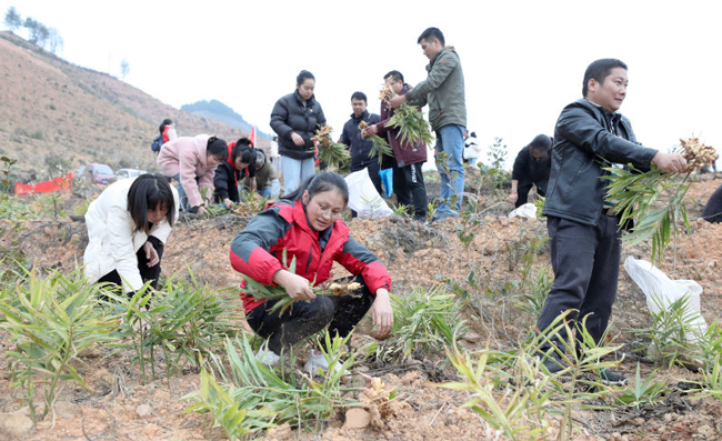 近日,在广西三江侗族自治县思欧村大福山油茶基地,近60名党员干部走进田间地头开展“助振兴、办实事、促发展”联合党建活动,帮助当地农户采收生姜,基地里穿梭忙碌的“红马甲”成为一道亮丽的风景线。