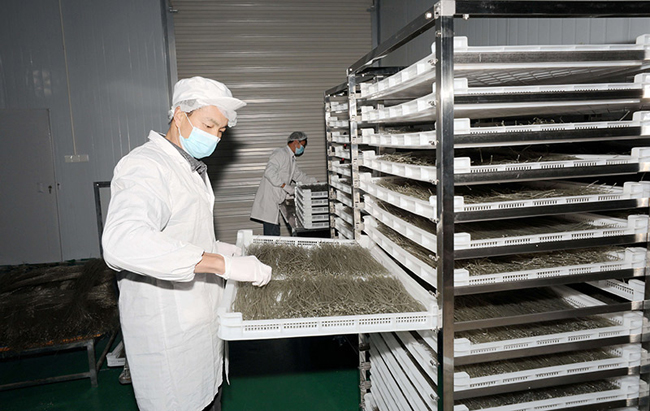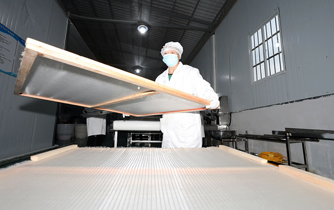 一名工人在车间内查看红薯粉风干情况。