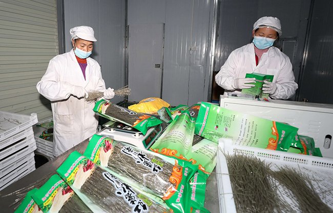 两名工人在车间内包装红薯粉。