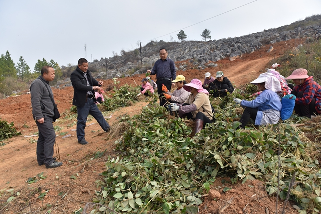 金银花种植基地位于一个杂草丛生、乱石堆叠的低矮山坡上面。进入基地,许多村民正在对金银花苗进行修枝整形。部分坡地已经松土并开始种植金银花。
