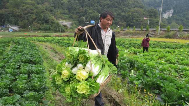 在2015—2020年的脱贫攻坚工作中,通过识别,何国方也被认定为建档立卡贫困户。在联系帮扶干部的引导下,何国方带着试一试的心态走出大山,来到城关镇拉易村拉易屯租田种植水稻和蔬菜。开始,担心种不好水稻和蔬菜,他先租一两亩稻田进行试种,尝到甜头后,他开始尝试扩大种植规模。到2021年,他总共租了5亩田用于种植水稻和蔬菜。在当地农业技术干部的指导下,他采用一季水稻加一季秋大白菜种植模式,即春夏季种植一季中稻,解决一家人的吃饭问题,等中稻收割后,即抢时间种植一季秋大白菜,解决家庭经济收入问题。据何国方介绍,今年,他所种的5亩水稻总收稻谷2600多公斤,种植大白菜,总产12500多公斤,大白菜销售收入达30000多元。