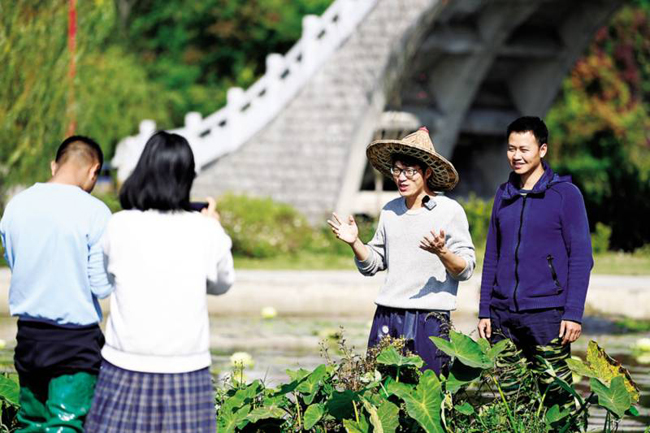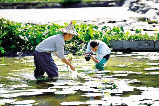 初冬时节的一个下午,戴着竹壳帽、穿着水裤的韦宝西,一边采摘金黄色的花朵,一边指导摄影师选取拍摄角度,再拿起九品香莲茶进行推介。最终,剪辑后的视频将通过韦宝西的网络平台账号发布。