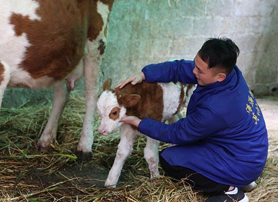龙开村骉骉种养专业合作社的饲养员在照顾新生牛犊。